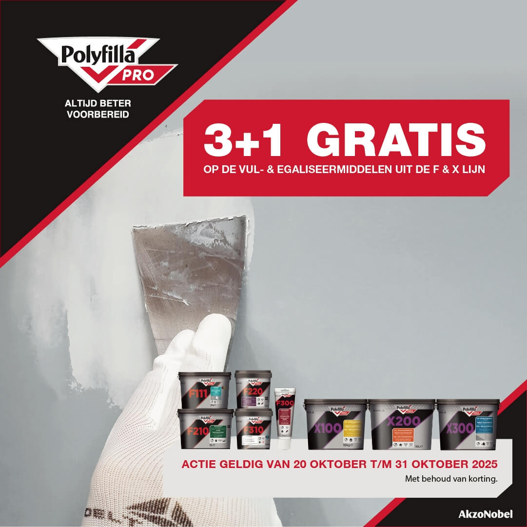 Actie3+1 op vul- en egaliseermiddelen uit de Polyfilla Pro F & X-lijn