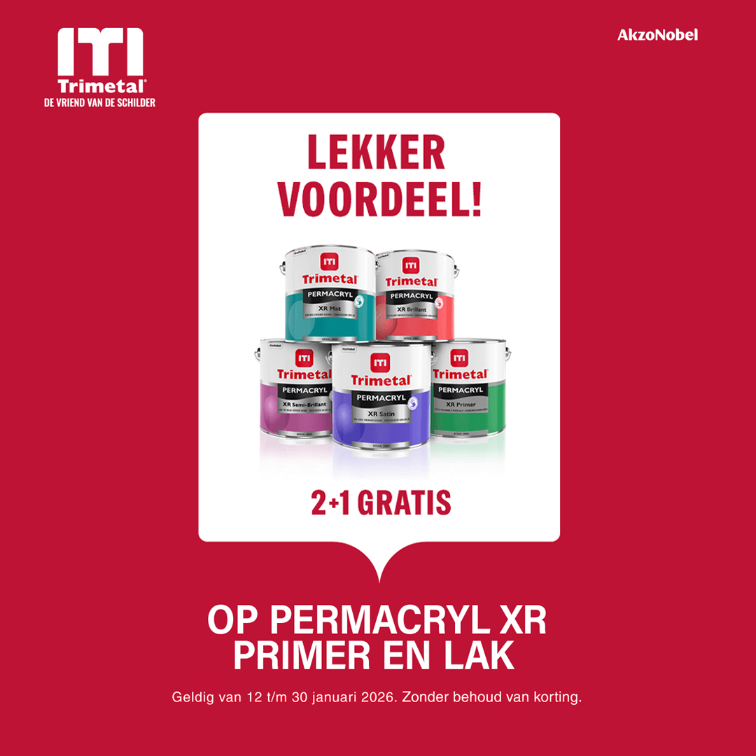 Van 12 t/m 30 januari krijg je 2+1 gratis op Trimetal Permacryl XR primer en lak. Dit geldt voor zowel 1 als 2,5 liter verpakkingen! Permacryl XR heeft een goede vloei en dekkracht, is slijtvast en extreem resistent tegen krassen en huidvet. Pak hem nu, gewoon lekker voordeel!