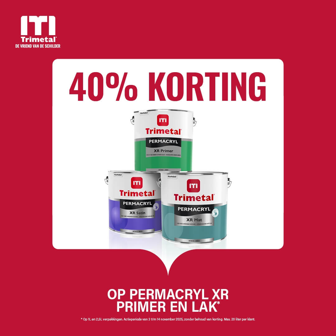 Van 3 t/m 14 november krijg je 40% korting op Trimetal Permacryl XR primer en lak. Dit geldt voor zowel 1 als 2,5 liter verpakkingen! Permacryl XR heeft een goede vloei en dekkracht, is slijtvast en extreem resistent tegen krassen en huidvet. Gewoon een scherpe deal!