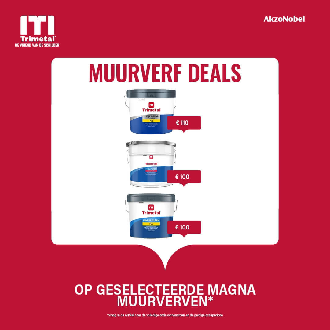 Van 12 t/m 30 januari is Trimetal stapelgek geworden! In deze periode profiteer je van een vaste kortingsprijs op geselecteerde Magna muurverven: Magna Clean (€ 100), Magna Protect (€ 100) en Magnacryl Prestige (€ 110).