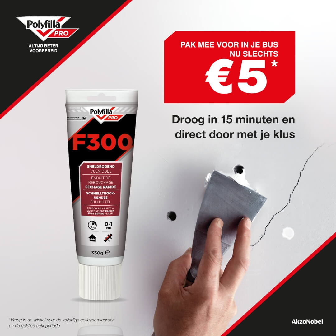 Pak hem mee voor in je bus! Van 12 t/m 30 januari betaal je slechts €5,- voor een tube Polyfilla Pro F300. Profiteer nu!